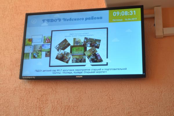 В настоящее время в детском саду в состав информационно-технической базы входят: 3 интерактивные доски с проектором (в 1 речевой группе, 3 речевой группе, 2 речевой группе), 5 планшетных компьютеров,1 интерактивный стол (в 3 оздоровительной группе), 5 комплектов ПК, 4 ноутбука, 2 мультимедийных комплекта, 5 телевизоров, DVD приставки.